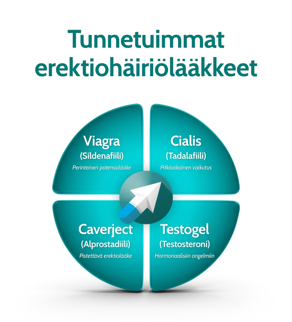 - Viagra (Sildenafiili) – Perinteinen potenssilääke, joka otetaan noin 30–60 minuuttia ennen yhdyntää.