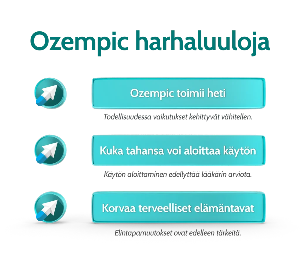 Ozempiciin liittyy monia virheellisiä käsityksiä. Yleisiä harhaluuloja ovat esimerkiksi: