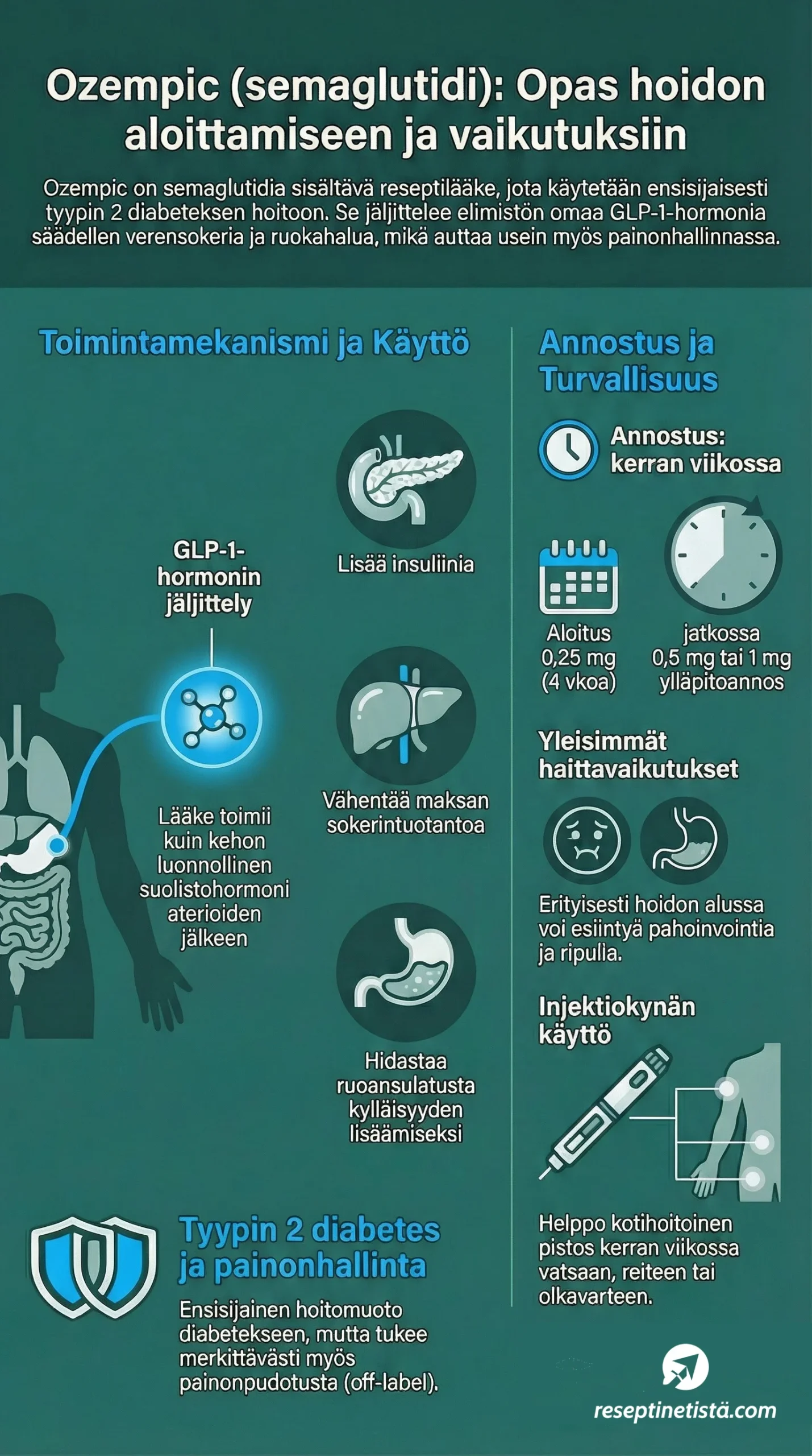 Tämän sivun tarkoitus on toimia kattavana, selkeänä ja luotettavana tietolähteenä Ozempicista. Sen tarkoituksena on vastata yleisimpiin kysymyksiin, joita lääkkeeseen liittyy ja tarjota lukijalle realistinen kuva siitä, mitä hoito tarkoittaa käytännössä. Sisältö perustuu lääketieteelliseen tietoon ja noudattaa terveydenhuollon yleisiä suosituksia.
