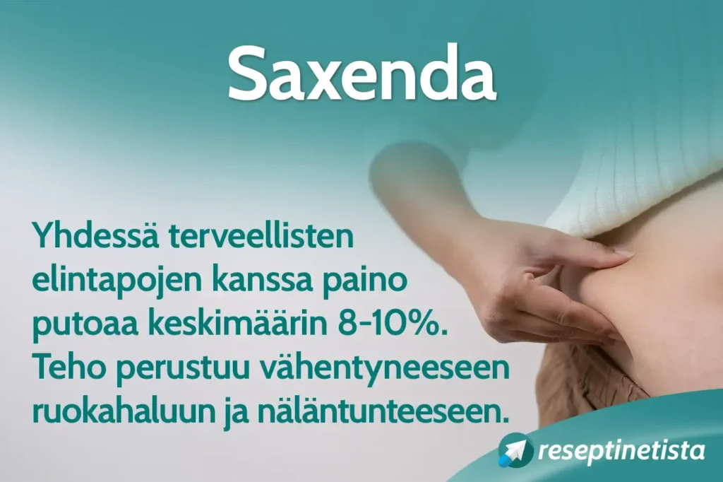 Saxenda (liraglutidi) on laihdutuslääke, joka yhdessä terveellisiin elintapoihin pudottaa painoa keskimäärin 8–10%. Painonhallinta perustuu vähentyneeseen ruokahaluun ja näläntunteeseen sekä kylläisyydentunteen lisäämiseen.